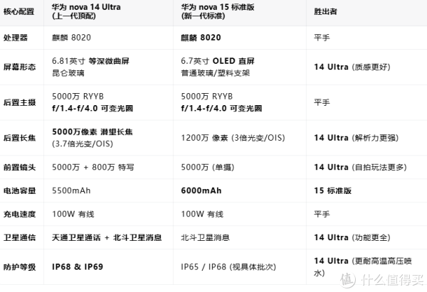 一句话追念:nova 14 Ultra 是“真香”旗舰,硬件万能;nova 15 圭臬版是“实用”新机,续航更强。